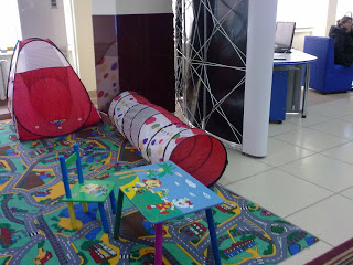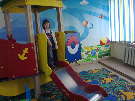 Но самое удивительное, это то, что наши чиновники наконец подумали и о людях, которым по разным причинам приходится привести с собой детей. Понятно, что им в таких заведениях дико скучно и неинтересно, они начинают или шалить или ныть. Так вот наконец, во впасение всех, построили в углу прекрасную детскую площадку, а которой мы и оставили Каринку, пока решали свои дела.