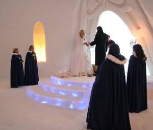 Одно из интереснейших предложений для монреальцев в Ледяной деревне- возможность провести церемонию бракосочетания в настоящей, но снежно-ледяной часовне на территории отеля.