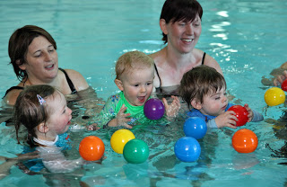 Каждому малышу одевается пластиковый спасательный пояс, а в течение занятия (50 мин) тренер использует массу ярких дополнительных приспособлений- игрушки, мячики, гантельки, резиновые уточки, есть даже небольшая пластиковая горка, по которой надо съехать прямо к маме в воду. Все занятие направлено на преодоление страха воды у ребенка, закрепление основных навыков поведения в воде- лежать на спине и животе, пускать пузыри в воде (!) или нырнуть на мгновение- за это тренер дарит маленькую игрушку-приз, оттолкнуться от бортика и проплыть на животике или спинке 1-2 м до мамы(папы), как правильно вытягивать ручки вперед и ими помогать плыть. Все очень весело, радостно. Каринка каждый раз не хочет уходить.