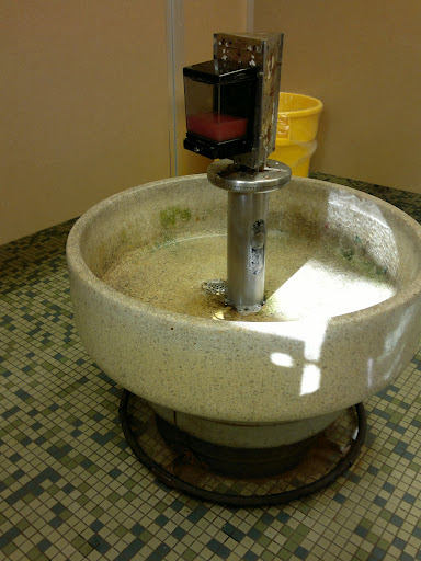Совместно с учителем мы сходили «на экскурсию» в туалет- он совсем рядом с классом и принадлежит только начальной школе. Кабинок много и всем хватит, чтобы избежать «неприятностей». Малышам показали как пользоваться рукомойником. Он весьма забавный, в виде фонтана. Нажимаешь педаль снизу и льется водиться, мыло тоже невысоко. Очень удобно мыть руки- не замочишь рукава о стол умывальника, как это часто бывает у деток, если кран высоко. Ну на фото смотрится не очень, конечно.
