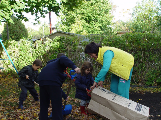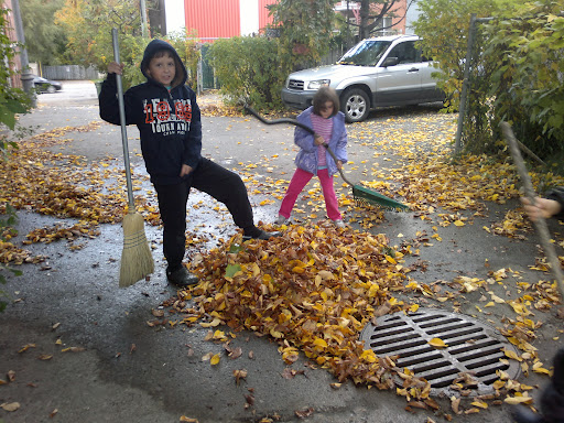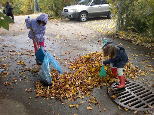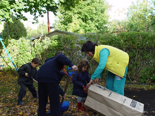 А пока реальность такова, что за окном три дня пасмурно, а листья бессовестно опадают с деревьев у нашего забора, на заднем дворе и за его пределами. Выбора все равно нет- грабли в руки и за работу! Как раз после обеда погода стала налаживаться прямо на глазах, выглянуло солнышко и была дана команда- все на свежий воздух!