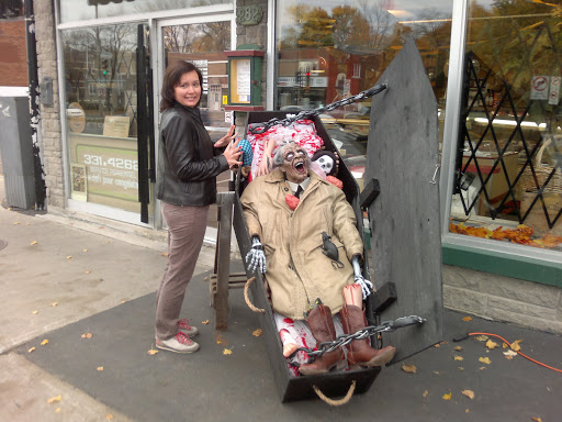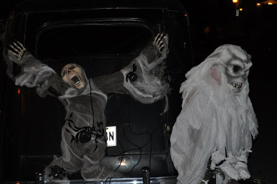 А нас с Кариной напугали в одном из магазинов, полностью декорированного в стиле Хеллоуина. Я фотографировала монстров и не знала, что Каринка забежала тоже. Вдруг из темноты выскочил переодетый в скелета и какого-то трупика парень и заорал диким голосом.