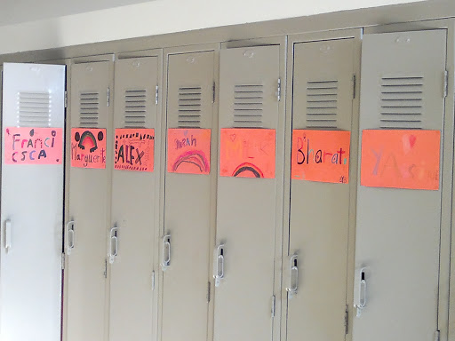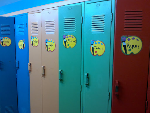 Как это принято, у каждого класса и у каждого ребенка для личных вещей есть свои шкафчики. У каждого класса они подписаны и раскрашены по своему.