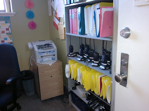 Когда дети гуляют на перемене, во всех школах за ними присматривают специальные учителя. У каждого учителя сервис-де-гарда в руках есть рация на случай непредвиденных обстоятельств. Вот какая батарея раций в этой школе. Впрочем, в нашей школе я видела рации у сотрудников и в течение уроков.