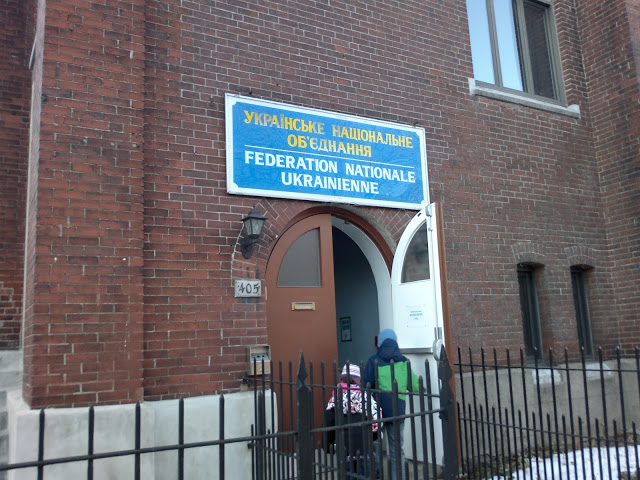 В том, что мы на месте, нам подсказала большая вывеска на украинском языке и несколько семей славянской внешности с детьми, которые тоже заходили в это здание. Было очень интересно увидеть украинскую надпись в Монреале. Для многих она, возможно, привычна и естественна, а для меня это было впервые.