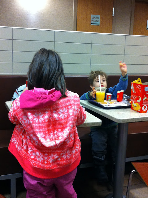 После салюта мы наконец-то встретились с Димой и Мариной, и поскольку сейчас не самое удачное время для долгих прогулок на свежем воздухе, мы поспешили укрыться в ближайшей кафешке, чтобы пообщаться и согреться. Детвора вдоволь нарезвилась с Владькой