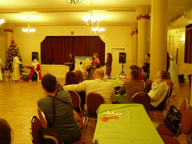 Оказавшись внутри, мы увидели большой, светлый и достаточно теплый зал, наряженный к Новому году, пусть и скромно. Мы переоделись и заняли места в зрительном зале. В нем было 4 длинных стола накрытых зелеными скатертями. Мы пришли почти в 15-00, но и после нас люди продолжали приходить. Некоторые были знакомы друг с другом, а некоторые, как и мы, просто садились на свободные места.