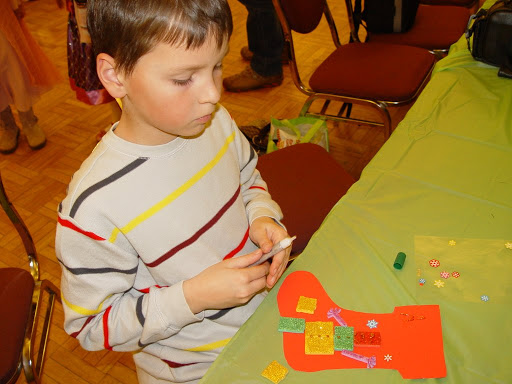 Единственное, что мне категорично НЕ понравилось, — так это задержка всего мероприятия почти на целый час. Вот это уже перебор. И, не зная всех деталей, могу предположить, что ждали именно художницу Инну Ломакину, которая устраивала мастер-класс. Именно она опоздала, и именно ее потом ждали во время второй паузы, пока она подготовит материалы для поделок и ей в этом помогали и организаторы и родители.- например прямо в зале вырезались заготовки сапожков из красного картона. Если это была пиар-акция для привлечения новых учеников, то лично для меня она провалилась с треском.