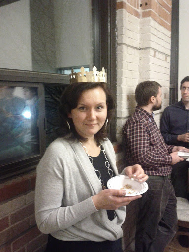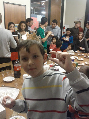 В каждом из 11 купленных пирогов было спрятано две маленькие фигурки- человечек и куколка (король и королева).Всех пригласили в кухню и на «раз-два-три» в случайном порядке каждый взял кусочек пирога. Победителям под апплодисменты одевали бумажные золотые короны, а всем желающим наливали знаменитый яблочный сидр (как по мне- гадость редкая). Так уж случилось, что в прошлом году фигурка короля попала Марату (но в прошлом году семьи не приглашали). А в этом году фигурки попались мне и Артуру.