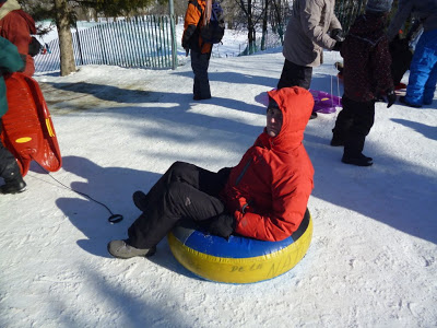Сначала мы катались только на своих санках, а потом Марат с Артуром взяли на прокат баллон. В следующий раз возьмем сразу три, а то за очередность катания наши детки порой спорили как воробьи, но идти за вторым в тот же день было далекова-то и уже не хотелось терять время на пешие путешествия «вхолостую», а хотелось побольше раз скатиться с горки.