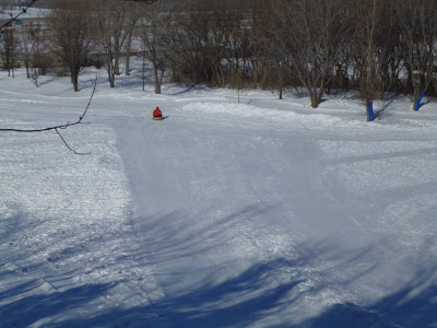 Вот горка, с которой мы катались. С верхушки идут пять дорожек разной формы и сложности. Надо сказать, что снег укатан безупречно, нет ни единого торчащего сучка или сильных впадин, из-за которых можно было бы перевернуться или удариться.