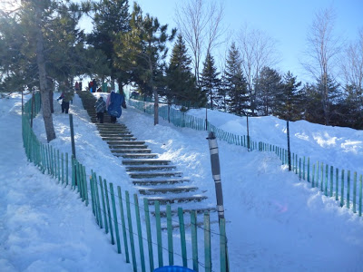 Хочешь кататься, люби и саночки возить, а в нашем случае еще и носить. И чтобы снова испытать восторг от скольжения вниз на высокой скорости, надо взобраться на холм по ступенькам. Правда, подниматься достаточно удобно. Ступеньки расчищены и посыпаны песком, а при нас их повторно посыпали солью в 13-00, чтобы исключить вероятность падения.