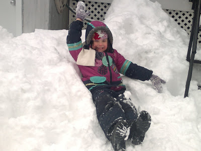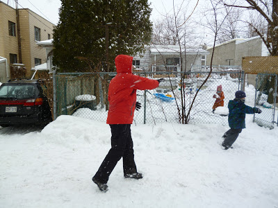 И хоть в окно, выходящее на парадное крыльцо, смотреть не так весело (из него видно нашу машину, которая постепенно опять тонет под снежным покровом), зато вид на задний двор завораживал. Снег сегодня был крупный, хлопьями, падал тихо и красиво. Ветра не было, температура воздуха всего -2, то есть все просто так и звало нас на улицу.Ну мы были бы не мы, если бы не подкрепились перед прогулкой горячими блинчиками