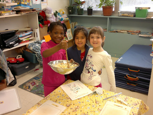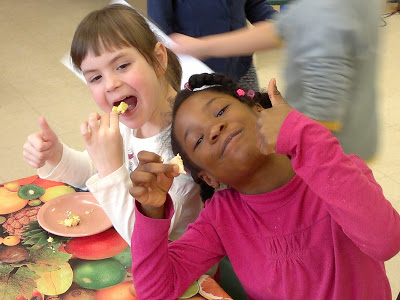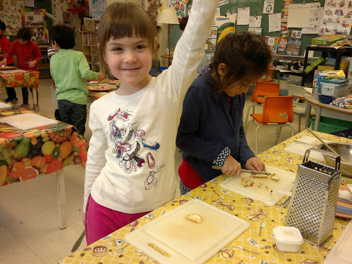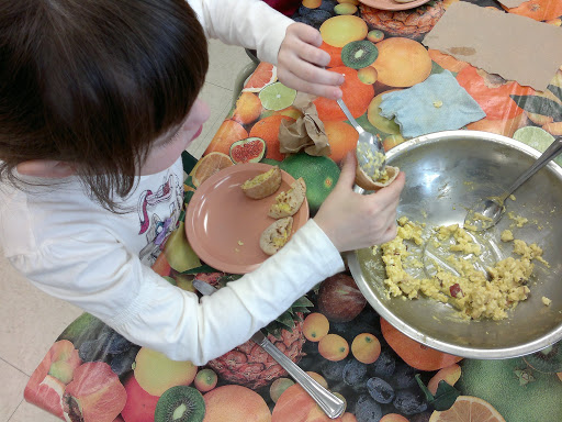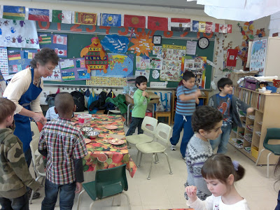 (я в глубине души очень надеялась, что они вареные. Страшно представить как разошлись бы дети, если бы им дали возможность взбивать сырые яйца для омлета, например! Мы бы потом и детей и класс три дня отмывали 🙂