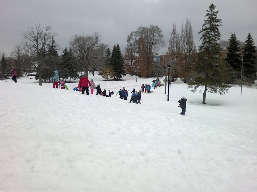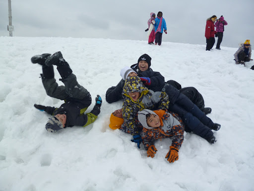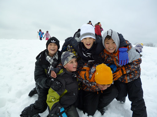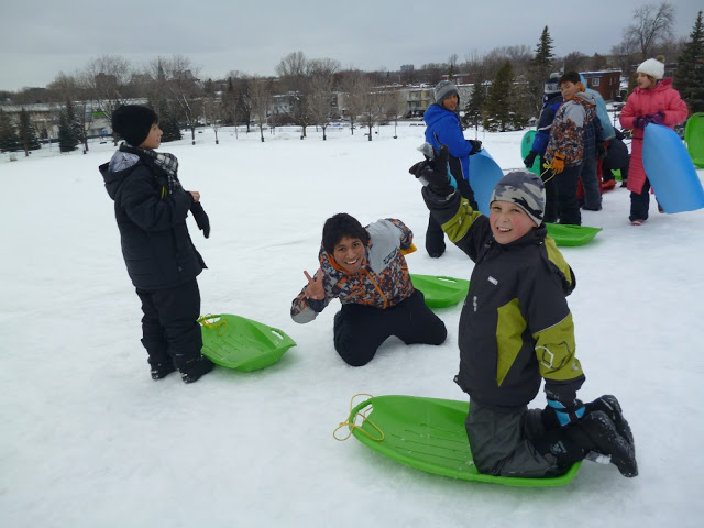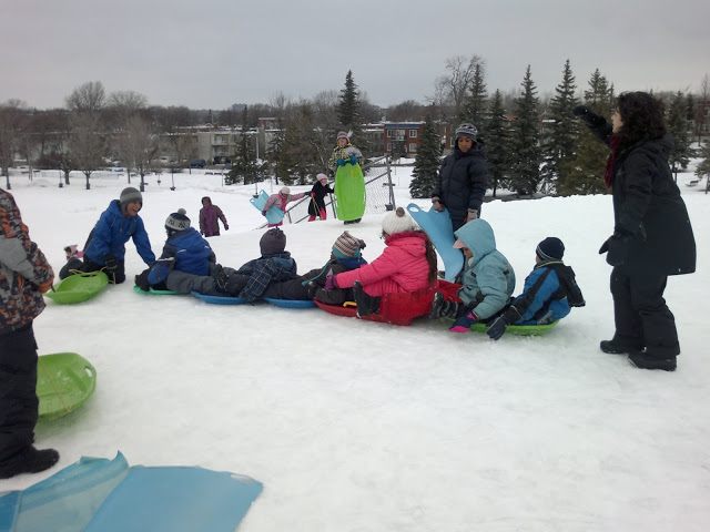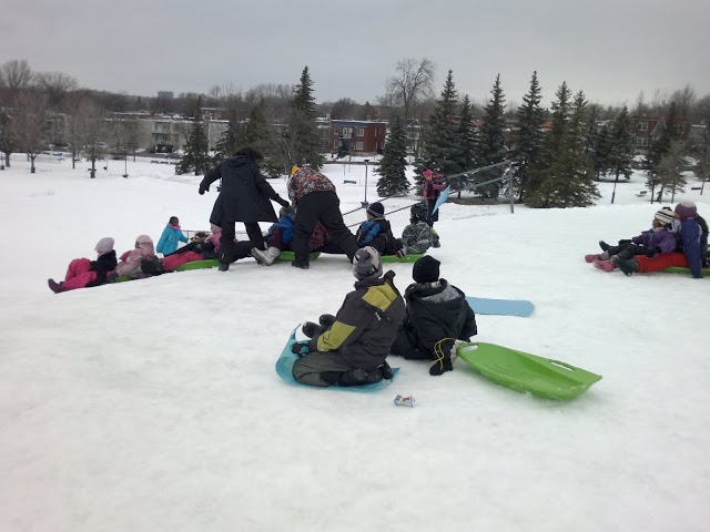 Если бы я сидела дома, то скорее всего, мне и в голову бы не пришло идти по сырой погоде и срывающемуся снегу кататься на гору на санках (и вообще выходить из дому). К тому же, автобус не заказывали, и два километра от школы до парка мы детьми топали пешком (и столько же обратно). Но по твердому убеждению канадцев, у природы нет плохой погоды! Поэтому уже после того, как дети на длинной перемене нагулялись на школьном дворе, все извозились вдоволь в снегу, их построили и повели дружно в парк.