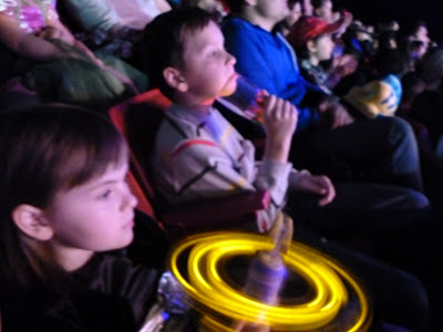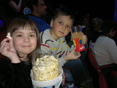 Естественно, каждый из деток зашел в зал со своим сувениром. Ну и с фирменным ведерком с поп корном. Здесь почему-то это просто обязательная часть шоу- грызть поп корн во время представления хотя меня, если честно, это немного раздражает, но пойти против традиции было непросто).