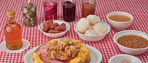 Как правило основной набор блюд везде одинаков: салат из капусты и маринованные овощи (лук, огурцы, свекла), гороховый суп, омлет с беконом или ветчиной, сосиски, жаренные ушки и конечно же оладьи с кленовым сиропом.