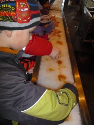 Естественно, как только мои дети слезли с телеги, их больше ничего не интересовало, кроме кленовых леденцов на льду. Пришлось подчиниться мелковозрастному большинству 🙂 и мы пошли искать место, где показано как же на самом деле производится кленовый сироп.