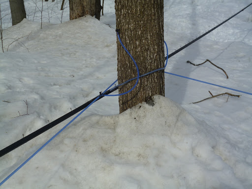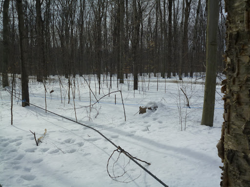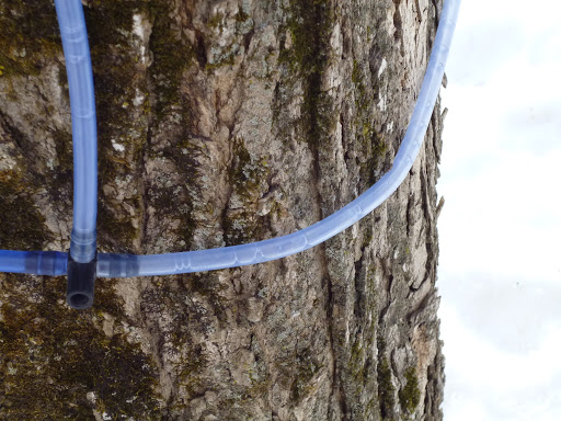 В отличие от прошлогоднего визита, где сок собирается в аллюминевые ведра, здесь все деревья между собой словно связаны паутиной пластиковых тонких трубок, по которым течет кленовый сок.