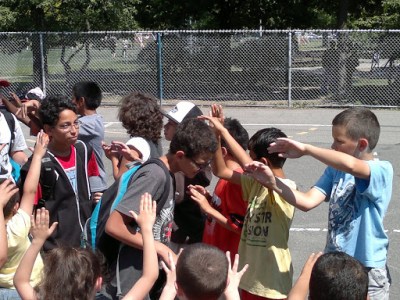А в 15-00, когда я приехала за детьми в школу, я увидела почти всех учеников на баскетбольной площадке да еще с рюкзаками. Сначала испугалась- что произошло?!! Эвакуация? Но когда увидела, что наша школьный бригадир помогает выстроить деток в две шеренги, увидела других учителей, то поняла, что просто происходит что-то организованное.