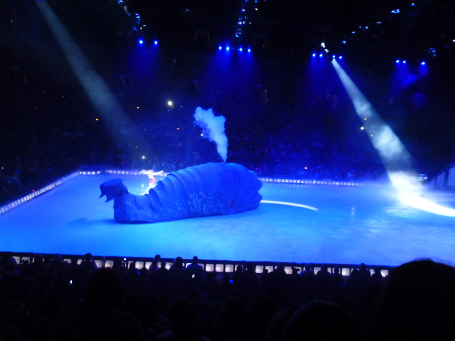 Ввиду того, что на сами выходные у нас тоже запланировано несколько мероприятий, мы впервые посетити вечернее шоу в будний день. Надо сказать, что моим деткам все-таки было сложно смотреть представление с 19-00 до 21-00 после школьного дня, еще и возвращаться потом домой 40 минут, Каринка даже заснула в метро. Хотя зал был забит до отказа (пустыми оставались только места под потолком), а возраст зрителей колебался от шестимесячного до… до дедушек и бабушек. Но для себя на будущее я сделала вывод посещать только дневные мероприятия. Артур, конечно, уже вырос из этих мукльтиков, но так как он сейчас занимается фигурным катанием, ему было интересно посмотреть именно на техническое умение фигуристов.