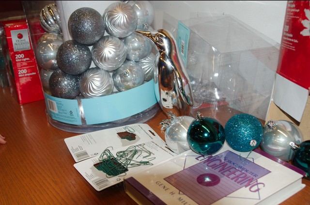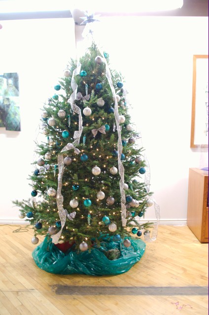 Елочка получилась милой. На ее украшение ушло два набора серебряных шаров по 75 штук, два набора синих шаров по 40 штук, два набора бантиков и два набора сосулек, плюс лента декоративная. Но елочка такая пышная, что можно было бы и еще добавить игрушек.