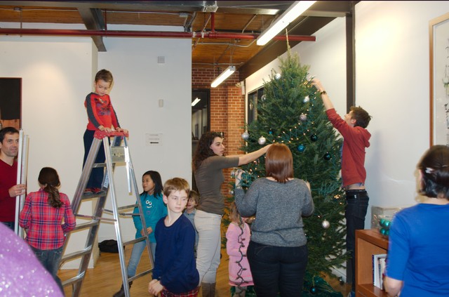 А второй повод- совместное украшение корпоративной елки. Накануне лесную красавицу купили и установили в холле, накупили массу игрушек в корпоративных цветах, а после рабочего дня офис стал заполняться шумом и гамом- подтягивались жены с детьми. 🙂