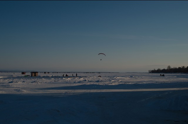 Вдалеке виднеются домики и десятки рыбаков на подледной рыбалке, а на горизонте- Америка))). Ну и морозный мартовский вечер как нельзя кстати подходит для полетов. 🙂
