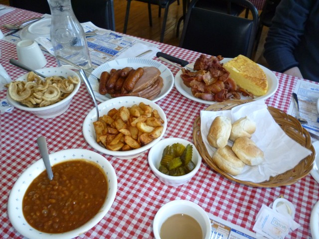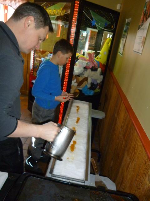 Любимое детьми лакомство — самокрутные леденцы- там доступно только при наличии билета. Т.е. 1 купон дает право на один леденец из кленового сиропа. Логично, что сладким баловаться надо после основной еды, поэтому сначала мы решили перекусить, время было очень даже обеденное. Но еще ни разу за все посещения ферм с кленовым сиропом мы не видели такого маленького количества людей. Обычно- шум, гам , очереди. В этот раз в 14.00 уже все разъезжались, а кроме нас, в зале было занято только четыре стола. Как объяснили мне на ресепшн, это только начало сезона, да и день перед школой, а вот на след.субботу у них уже бронь на 125 мест.