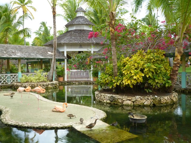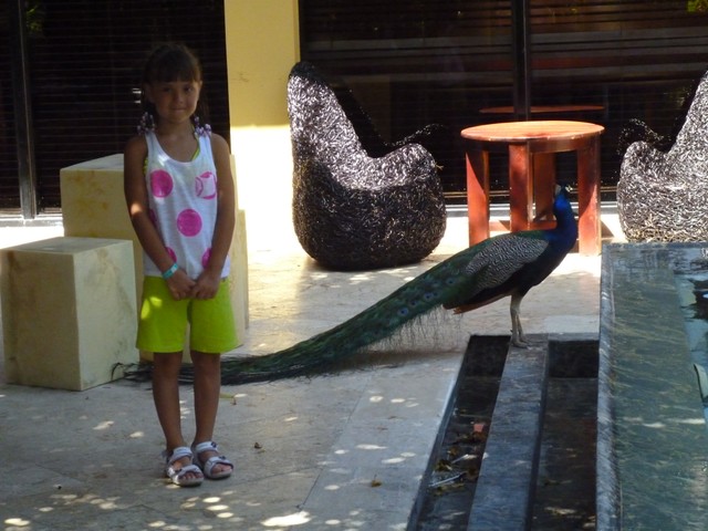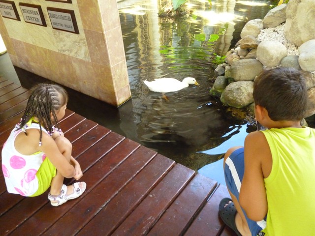Дети, конечно же, были в восторге от фламинго, павлинов и даже уточек. 🙂 В один из дней после завтрака, мы даже сопереживали во время акции по спасению одного из малышей утят. Он, глупый, заплыл под деревянный мост, а как выплыть из-за мешавших ему балок- не знал, только жалобно пищал. Попытки персонала оказались безуспешными, две девочки-отдыхающие залились слезами от жалости к утенку. Тогда их папа (канадец, из Торонто) залез в пруд, нырнул в эту мутную водицу с головой под мост и вытащил… двоих утят! Радости детей и мамы-утки не было границ! Ну и 45 минут времени из длиииииного дня отдыхающих прошло увлекательно :-).