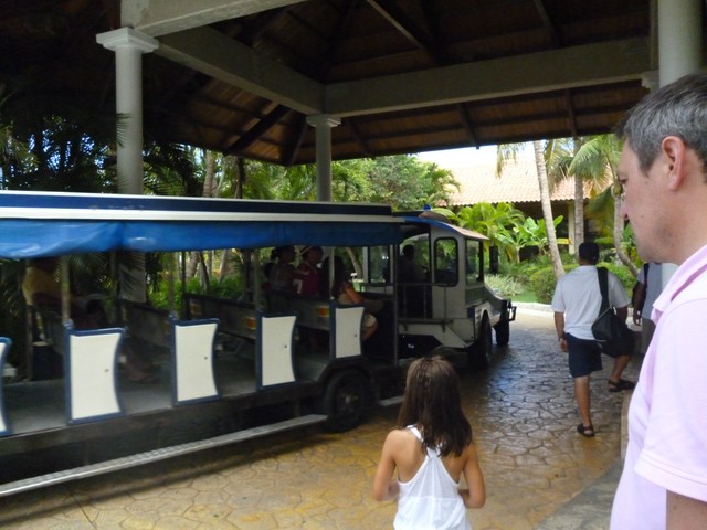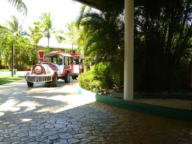 Территория отеля представляет собой условно букву Н, где если смотреть на океан, «в ногах» будет море-вода, «в голове»- рестораны, администрация, магазины. По этой букве Н курсирует паравозик (всего их три), чтобы доставить вас из одного конца отеля в другой. Кроме бесплатных паровозов на тридцать человек бесконечно ездят компактные машинки-такси, но ими бесплатно можно пользоваться, только если вы член «Клуб Мелия», либо кто угодно за 1-2 доллара (на всех пассажиров). Это конечно же, не стоимость официального билета, а галантное «Грасьяс, амиго» в кармин амиге.
