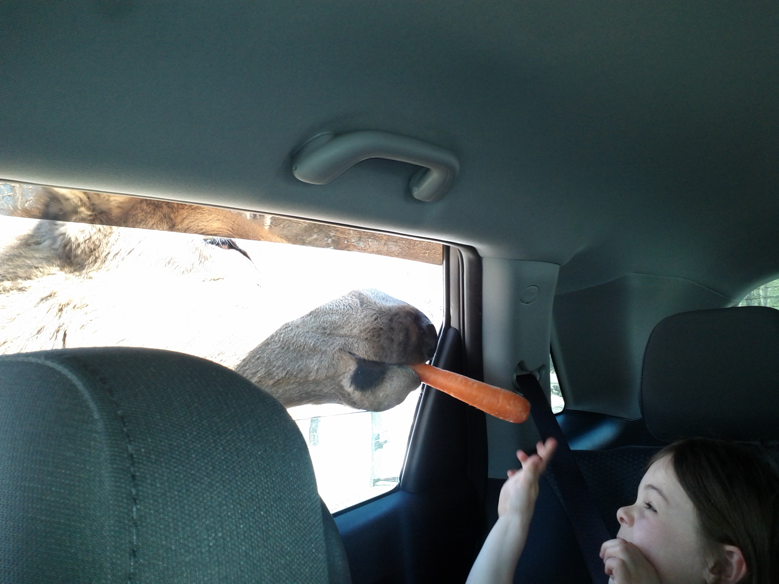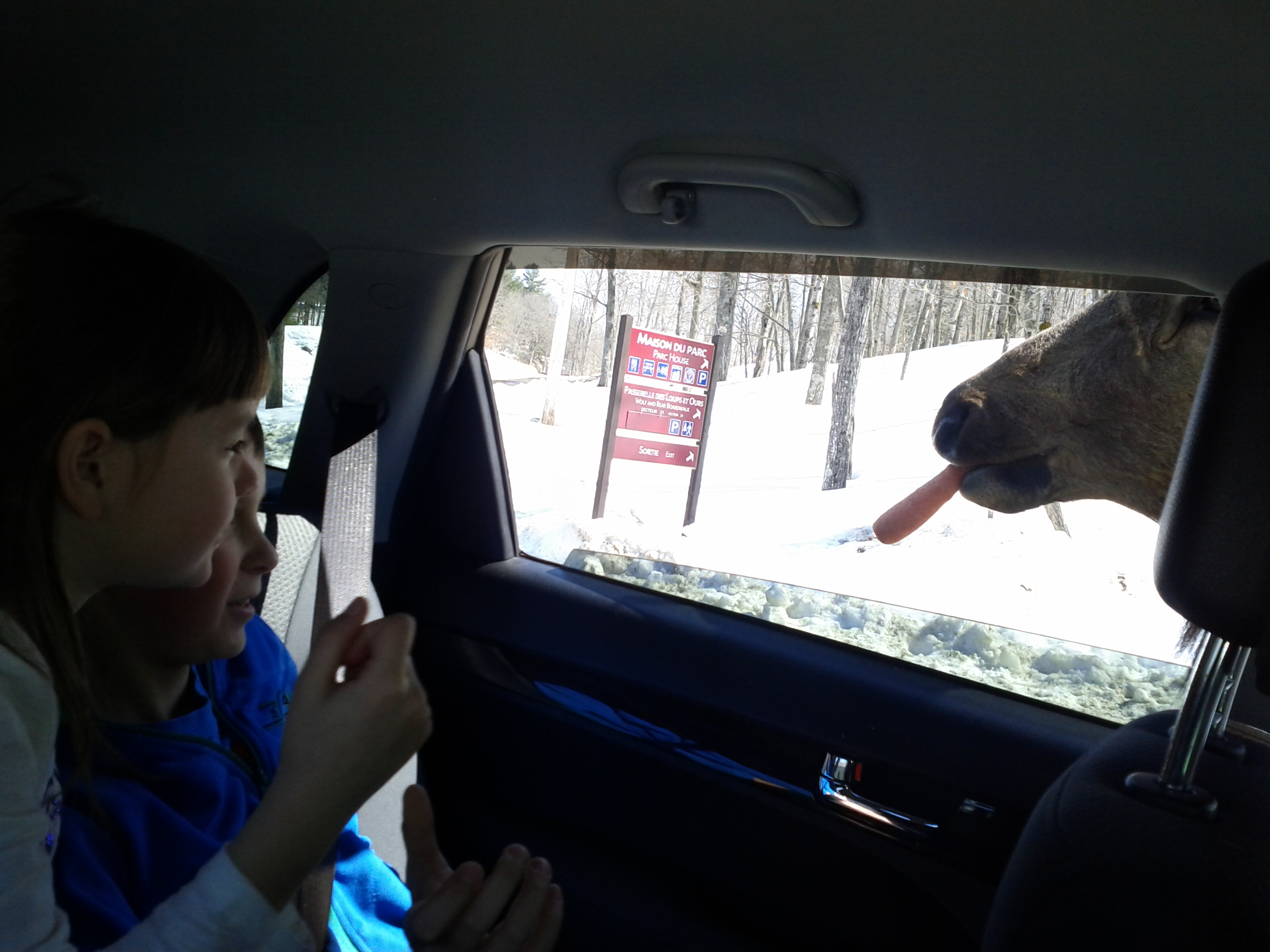 Животные непуганные, оттого нужно постоянно быть начеку, чтобы кого-то не придавить под колесами. Пока мы кормили оленят с одной стороны машины, с другой стороны в маратовское окно просунул голову большой олень и лизнул его. Ору и эмоций (как у Марата, так и у детей  🙂 ) было море.