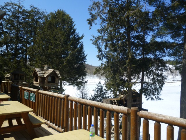Сейчас природа,конечно, еще спит, повсюду лежат снега. Но даже это не портит впечатление от окрестностей. Можно только представить как там здорово, когда река вскроется ото льда, а  склоны и поля укроются зеленью и цветами. Последний отрезок пути пролегает вдоль берега реки, по центру которой проходит граница между Квебеком и Онтарио.