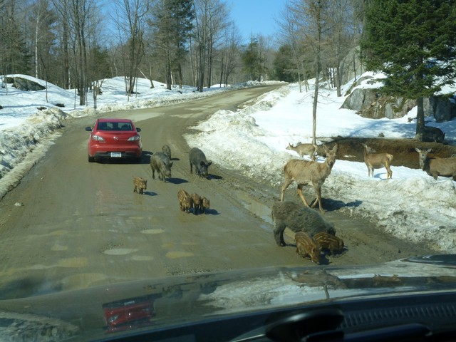 И это учитывая тот факт, что мы приехали в середине дня, то есть животных уже до нас бесконечно кормили. Но на всей территории парка животных много. Часть из них бродит по тропинкам вдоль машин, а очень много четвероногих нежились на проталинах на солнечных полянках с полузакрытыми глазками. Видно было, что им хорошо, их все устраивает. 🙂