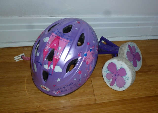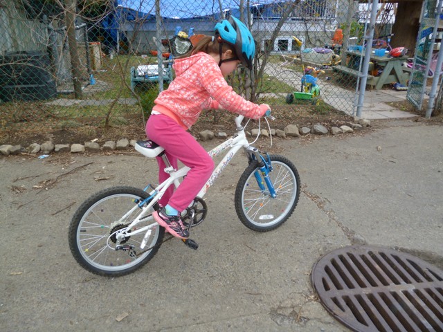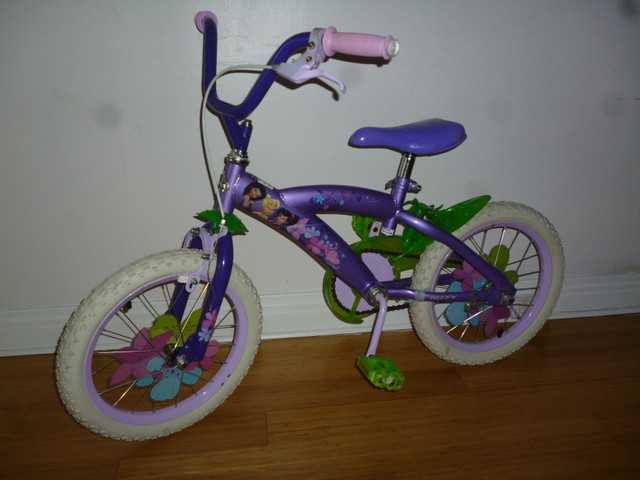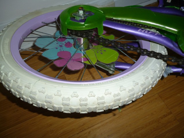 P1050877Ну и вторым моим канадским опытом — была продажа первого Каринкиного велосипеда. Одежду, из которой выросли дети,  я отдаю соседям поблизости, а велосипед на семейном совете решено было продать и сделать небольшой «взаимозачет» на обновление автопарка Карины. Велосипед наш действительно был в очень хорошем состоянии, без единой ржавчины, самыми «пострадавшими» почему-то были тренировочные колеса, может потому что они пластмассовые, ну а белые шины ( диаметром 16″) вы сами увидите, просто идеальны. Велосипед всегда хранился внутри, никогда не мок под дождем.
