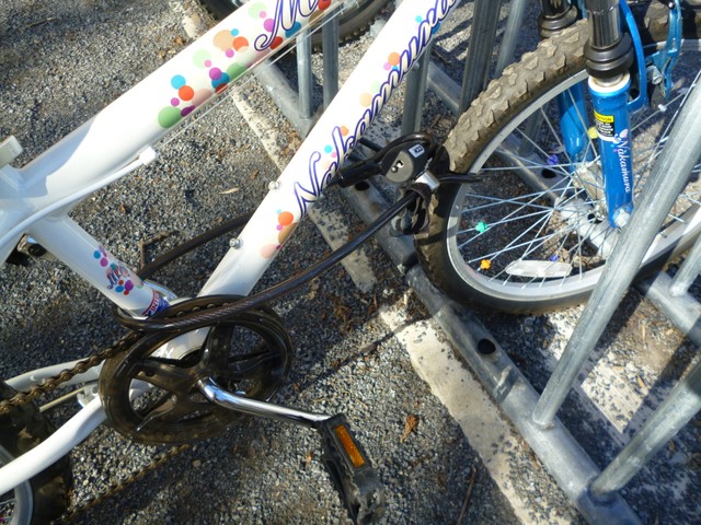 На всякий случай, все же надежно пристегнем нашего Двухколесного Коня. Хотя дважды велосипед оставался у школы непристегнутым на целый день , к счастью, никуда не пропал! 🙂