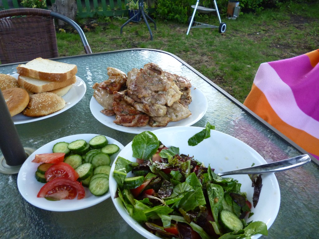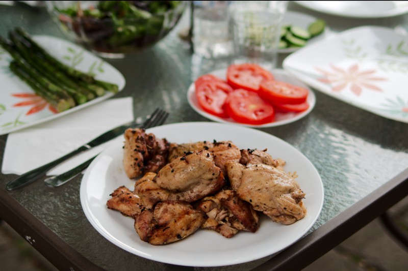 Все чаще и чаще мы едим на бэкъярде, или на балконе, а когда есть настроение — жарим барбекю. Надо сказать, что настроение есть очень часто, и если не на углях, то на портативном гриле я часто готовлю что-то к ужину. Признаться, мы очень полюбили такой вариант еды: обилие зелени и овощей к рыбе, мясу или птице. Без утяжеляющих картофельных и прочих гарниров.