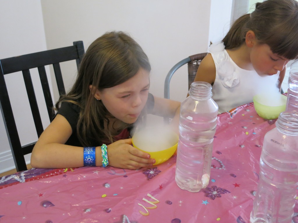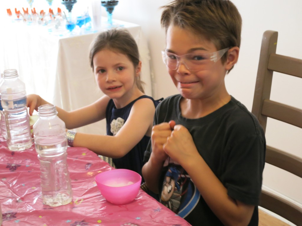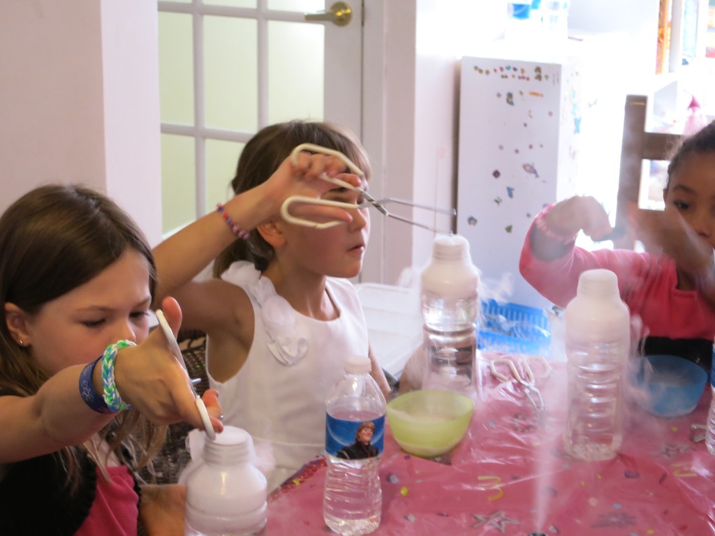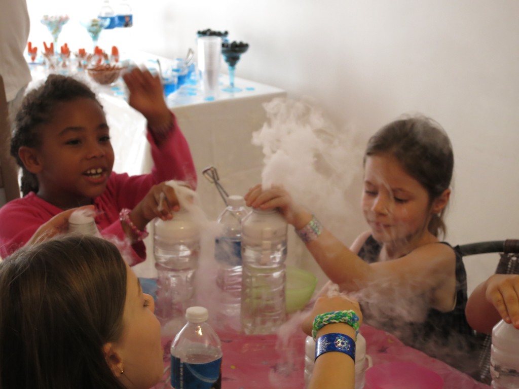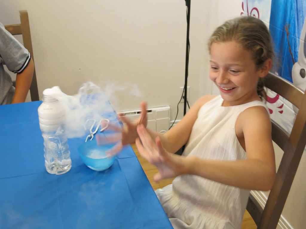 В обозначенное время стали один за одним, вернее, одна за одной, приходить гостьи с подарками. Дом наполнился щебетом, визгами, девчачьим смехом и возгласами.IMGP5198Но в назначенное время в дверь вдруг позвонили и к Карине пришел особенный гость. Это был аниматор Бугабу, который после недолгого веселого привествия именинницы, быстренько организовал детвору носить его реквизит из машины (!), а те безоговорочно повиновались, еще и наперегонки бегали и спорили кто какую коробку понесет. Потом он отправил всех вымыть начисто руки и уже только после этого всем раздал очки и… началось! Что и как это будет детально я не знала, я видела лишь несколько фото и коротюсенькое рекламное видео, но мне почему-то показалось что должно быть интересно всем, даже Артуру, и не ошиблась. Дети визжали, охали-ахали и творили экперименты.
