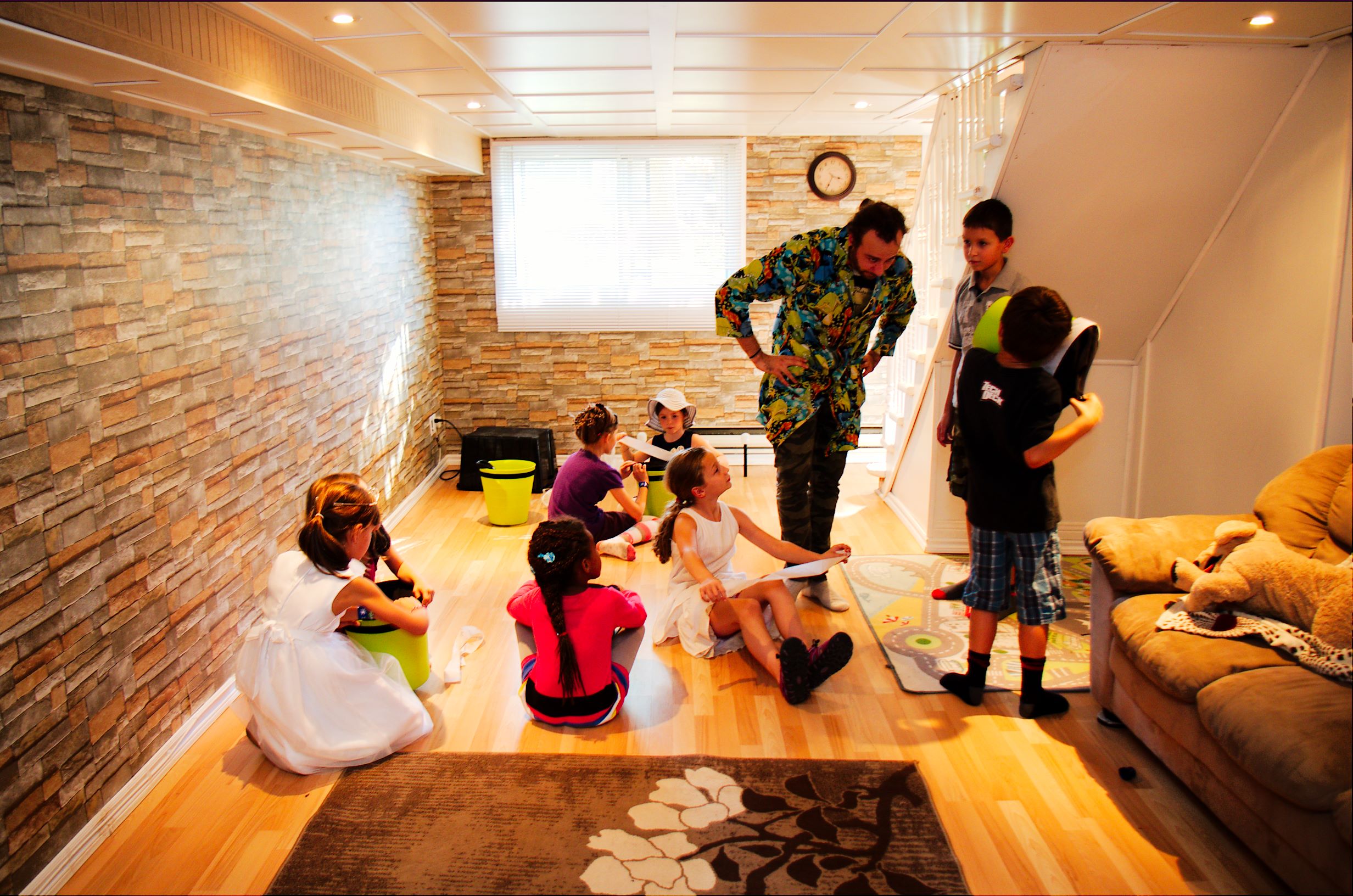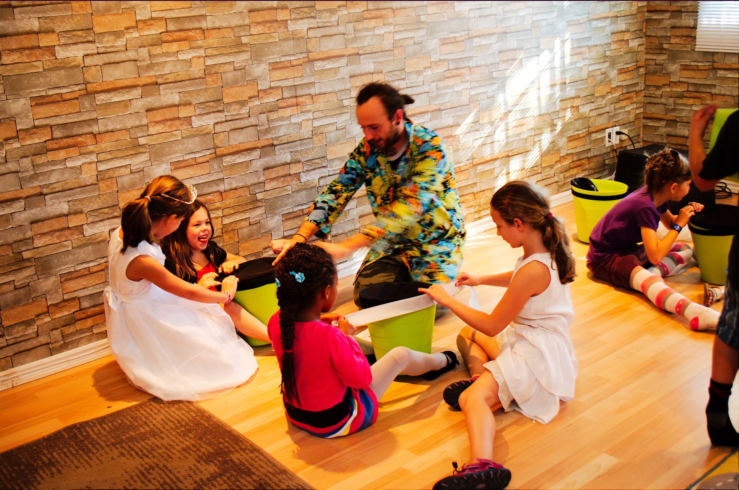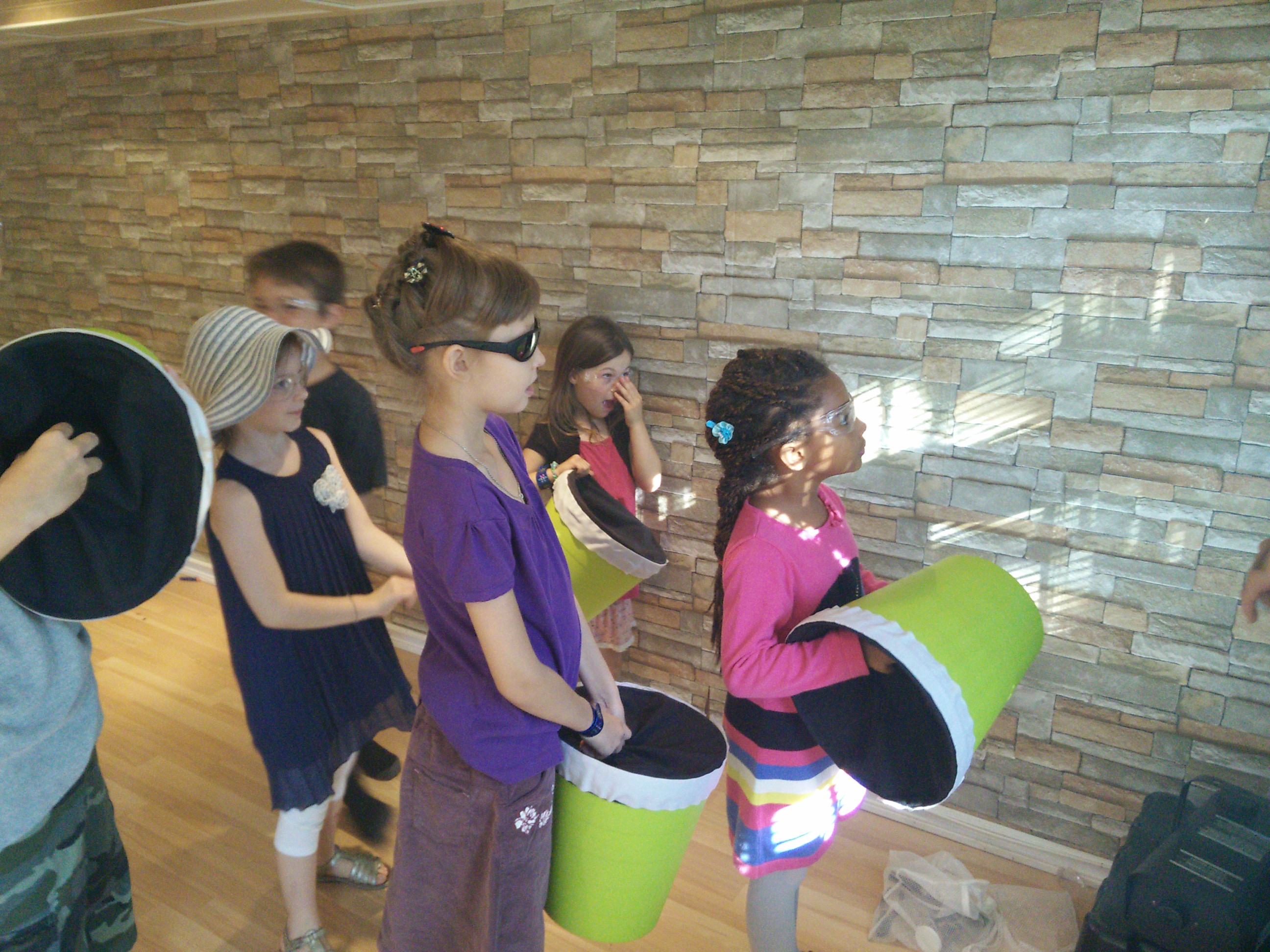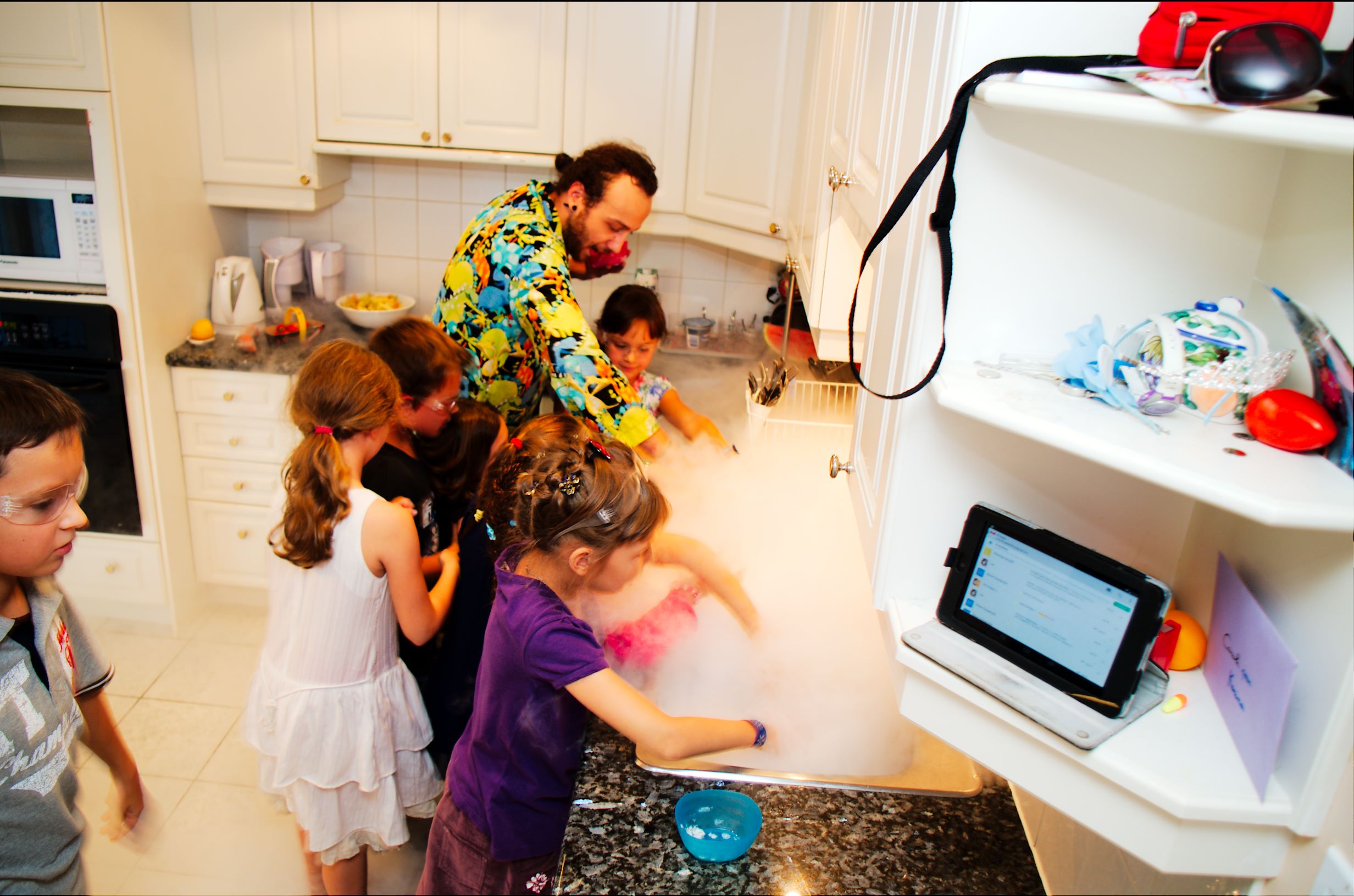 В обозначенное время стали один за одним, вернее, одна за одной, приходить гостьи с подарками. Дом наполнился щебетом, визгами, девчачьим смехом и возгласами.IMGP5198Но в назначенное время в дверь вдруг позвонили и к Карине пришел особенный гость. Это был аниматор Бугабу, который после недолгого веселого привествия именинницы, быстренько организовал детвору носить его реквизит из машины (!), а те безоговорочно повиновались, еще и наперегонки бегали и спорили кто какую коробку понесет. Потом он отправил всех вымыть начисто руки и уже только после этого всем раздал очки и… началось! Что и как это будет детально я не знала, я видела лишь несколько фото и коротюсенькое рекламное видео, но мне почему-то показалось что должно быть интересно всем, даже Артуру, и не ошиблась. Дети визжали, охали-ахали и творили экперименты.