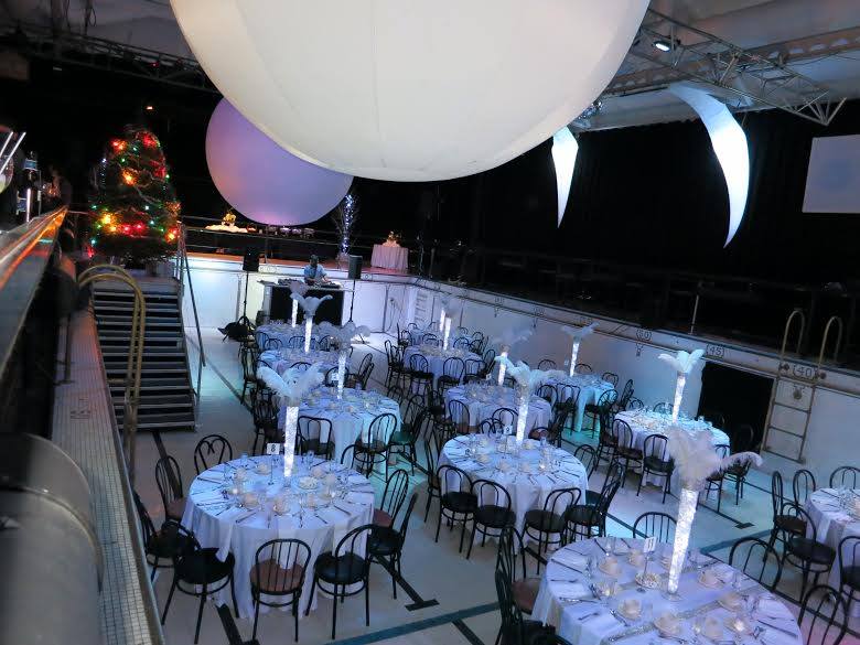 да, это помещение бывшего бассейна. Главным «ремонтом» стали черные натянутые стены-шторы, за которыми остался кафель, 🙂 Ну а остальной декор меняется в зависимости от тематики. Помещение безумно популярно для показов мод, корпоративов и просто тематических праздников.