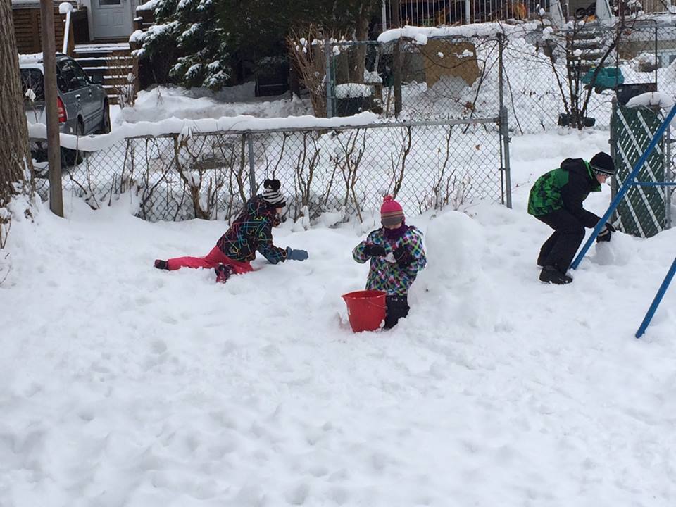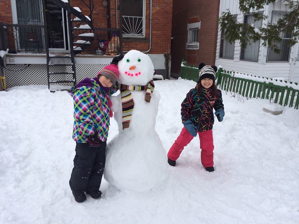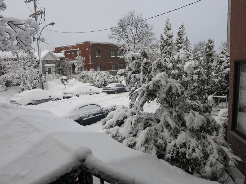 Ну а за окном утром вместо океана и солнца стандартный зимний квебекский пейзаж. Зато дети были в восторге. Им же не откапывать дорожки, а только беситься-веселиться. 🙂