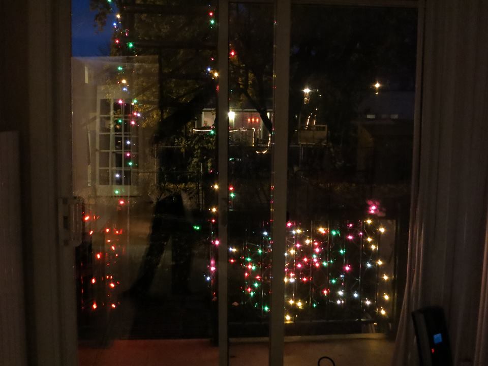 И тут мне открылась очевидная истина. Три года подряд мы своими украшениями поднимали настроение прохожим, а сами видели их мельком, когда заходили домой или выглядывая из окна. Но бОльшую часть времени мы проводим на кухне, большие окна которой выходят как раз на балкон заднего двора. И оттуда нас встречала каждый раз кромешная зимняя мгла. В этом году наши огонечки просто удивительным образом дополнили новогоднее настроение. Темнеет сейчас рано, поэтому как только мы приходили со школы в начале пятого, я сразу зажигала гирлянду и сквозь стекло мы любовались разноцветными огоньками. Так же некоторые наши соседи в этом году тоже включили гирлянды на бэкъярдах, и детям было веселее играть на улице между домами.
