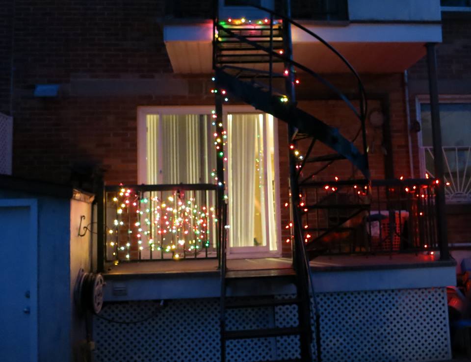 К нашему разочарованию выяснилось, что на парадном крыльце наружная розетка перестала работать. То ли окислилась, то ли еще что с ней случилось, но стало понятно, что переливаться огнями наш фасад дома не будет. Вторым нас подвел снеговик: он тоже не горел. И хоть запасные лампочки у нас есть, я просто не представляю, как народ умудряется найти среди 100 штук именно ту, дефектную. 🙂 У меня на это никогда в жизни терпения не хватит. Но снеговика мы все-таки оставили, прикрутили на крыльцо, так как он сам по себе немного блестит, и в свете фар проезжающих машин его тоже замечательно видно. Остальные гирлянды мы взяли в охапку и пошли на балкон, выходящий на задний двор. Меряли, крутили, прикручивали. Худо-бедно сорок минут на улице мы провозились и что-то прикрутили да зажгли))