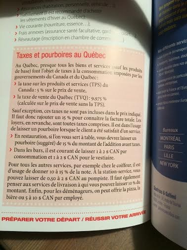 И тут очень кстати придется официальная информация в отношении чаевых в Квебеке, с которыми ознакамливают каждого новоявленного иммигранта.  Вот в моих руках сборник с ответами на все вопросы по жизни в Квебеке, свеженький, датированный 2015 годом.IMG_3627