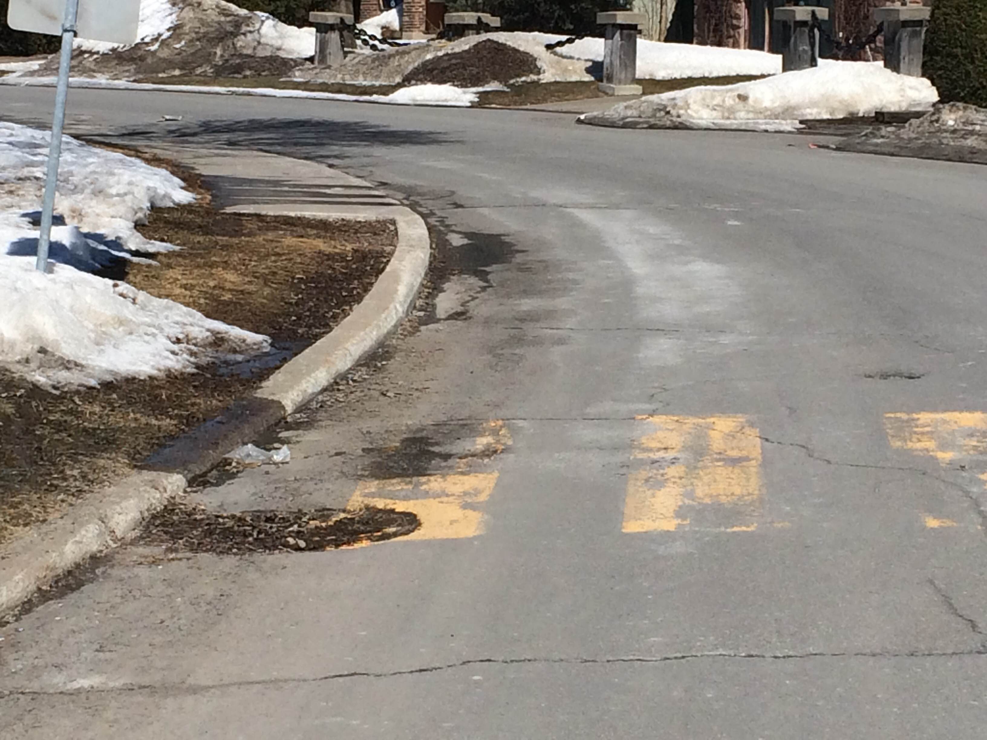 На фото ниже будут снимки перекрестка рядом с нашим домом. Ну что можно сказать, не повезло. В нашем же районе есть и более благополучные участки, а есть ямы и посерьезней. Благо эти «засадные» места известны и я или делаю лихой вираж, либо вообще предпочитаю параллельную улицу. Проблемные участки есть и в Утремоне, и в Розмоне, и в Монт-Рояле и вдругих частях города.