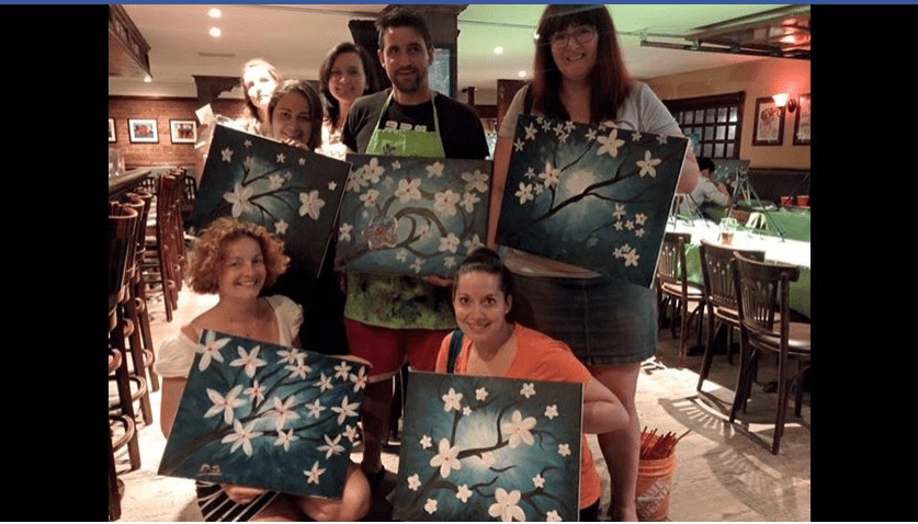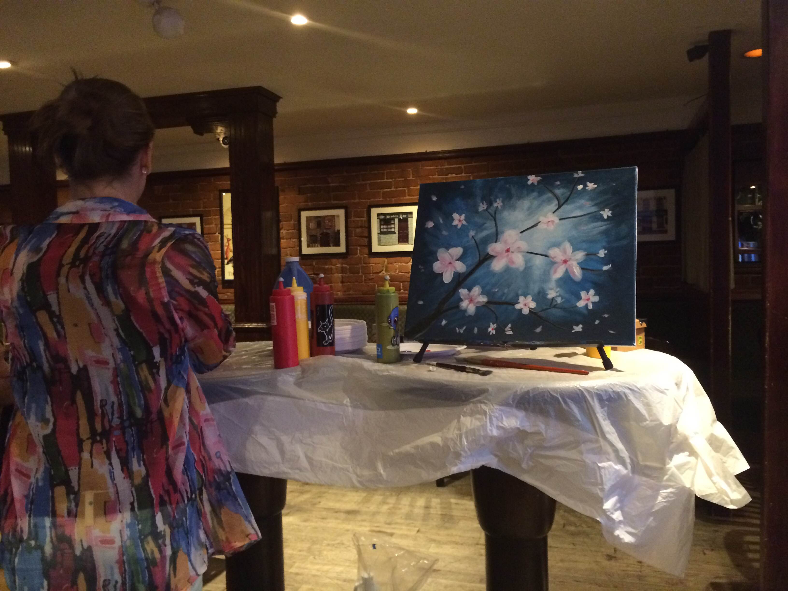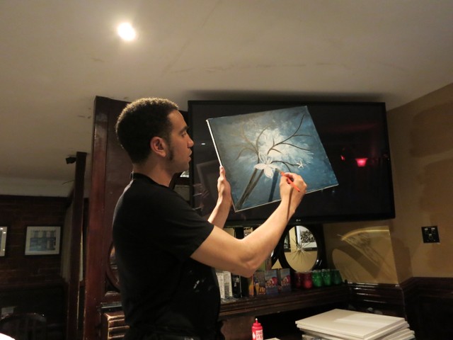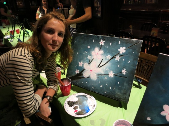Всего участников было человек тридцать, самых разных возрастов, и девушки-бабушки и молодые-люди-дяди. У многих не было никакого опыта в рисовании, а кто-то уже не первый раз на Paint night Нужно было смотреть на образец,IMG_3386 но бОльше внимания уделять объяснениям художника и поэтапно повторять то, что рисовал он. Художник объяснял сначала все подробно, старался шутить (говорил на двух языках, но в итоге это был фринглиш), а вот ближе к окончанию вечера как-то сник и уже руководил нами без огонька.IMG_3843 IMG_3846 IMG_3848 IMG_3847