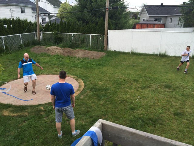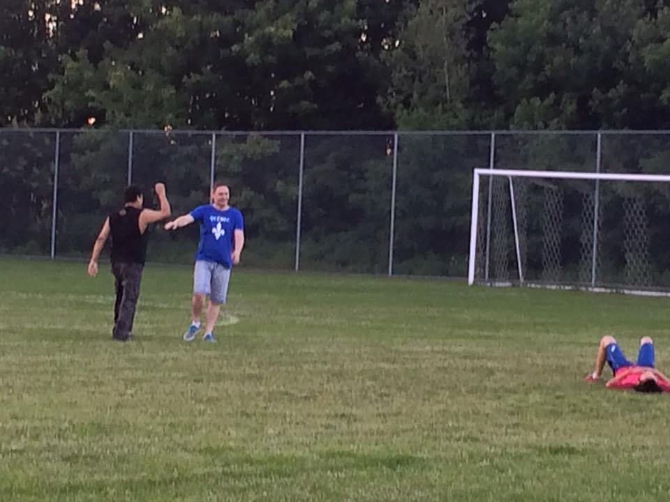 но заинтригованные моими восторженными рассказами про район, тоже вызвались походить-погулять по окрестности. Неожиданно дошли мы до футбольного поля… и состоялся матч поколений.