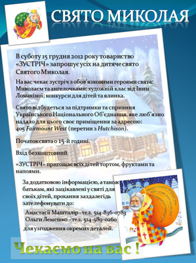 Случайно наткнулась на приглашение украинской организации «ЗУСТРIЧЬ» на детский праздник Святого Николая. Обещалась культурная программа, конкурсы возле елки и даже подарки от Николая.