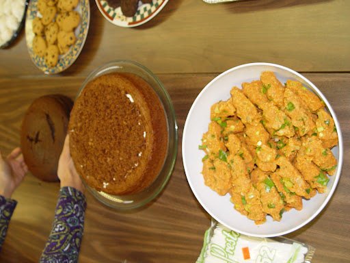 Очень много было восточных сладостей домашнего приготовления. Но для меня они слишком приторные. И, видимо, не только для меня. Потому как большая коробка конфет — классическая визитная карточка Украины — «Вечерний Киев», предусмотрительно купленная мной накануне в русском магазине, разошлась просто на «УРА!», а некоторые еще и деткам своим домой взяли.